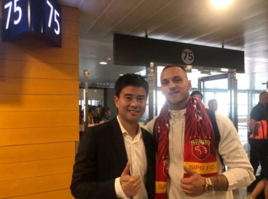 上港俱乐部副总经理孙祥直接在登机口迎接阿瑙托维奇,并且为其带上了上港队的红色围巾。