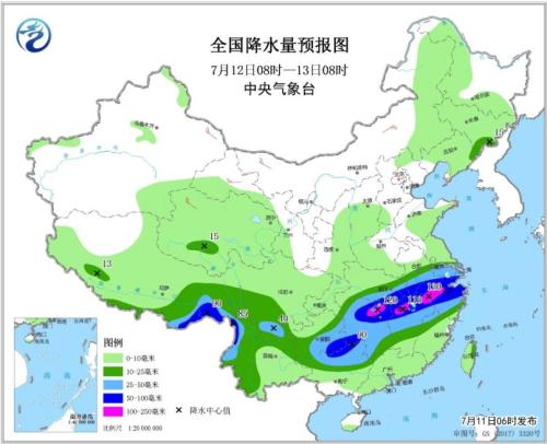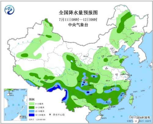7月11日08时至12日08时,西北地区东南部 、西南地区东部、华南大部、江南中南部、云南大部、西藏中南部等地有中到大雨,其中,四川盆地中部、贵州北部、云南西北部、西藏东南部等地局地有暴雨(50~90毫米);华北大部、黄淮大部、东北地区、内蒙古东部等地有阵雨或雷阵雨。新疆北部、甘肃中西部、内蒙古中部等地的部分地区有4~6级风。