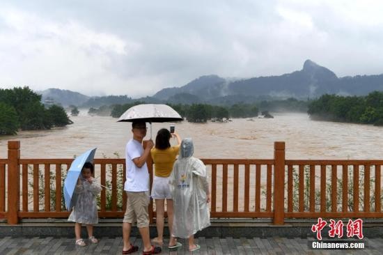 7月9日,受连日来持续强降雨影响,福建武夷山河水暴涨,武夷山风景名胜区全面闭园,暂停接待游客。图为一家人在武夷山景区外一座桥上观看洪峰过境。中新社记者 王东明 摄