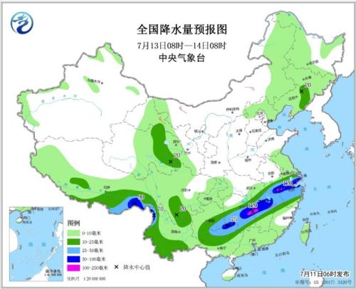7月13日08时至14日08时,江淮南部、江南北部和西部、贵州南部、广西中北部、四川南部、云南南部和西部、青海东部、西藏南部等地有中到大雨,其中,上海、江苏南部、浙江北部、安徽南部、江西中北部、湖南中部、广西北部、云南西北部、西藏东南部等地的部分地区有暴雨,局地大暴雨(100~120毫米)。内蒙古中西部、甘肃北部等地的部分地区有4~6级风。