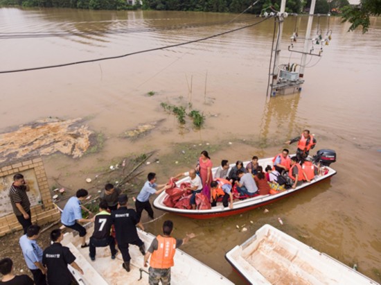 7月10日,湘江大堤湖南衡山县长江镇曹家湖段出现漫堤决口,衡山县人武部迅速集结专业救援队伍,对群众进行救援(无人机拍摄)。新华社 图