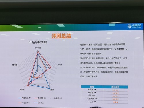 无线投屏器评测通过基本功能、软件、硬件、稳定性、易用性共5大维度23项指标进行评测。中国移动挑选了5款产品分别是电视果4K、天猫魔投、海备思、仁德 K6、G9 Plus。