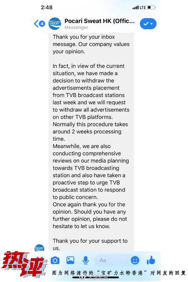 看文字,读语义,知态度。我再来简单翻译一下:哎呀,其实我们比你想到的还早,上周我们就做出撤广告的决定啦。不仅如此,我们还要求TVB,你得回应公众关切呀。我们作为一家公司,不仅产水卖水,我们还要搞政治呢。你有啥想法,别犹豫,告诉我们,我们替你表达……