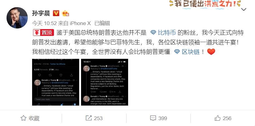 荔枝新闻讯 7月12日上午,孙宇晨发微博称鉴于美国总统特朗普表达他并不是比特币的粉丝,我今天正式向特朗普发出邀请,希望他能够与巴菲特先生,我,各位区块链领袖一道共进午宴!我相信经过这个午宴,全世界没有人会比特朗普更懂区块链 !