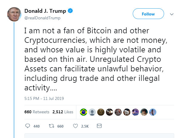 特朗普在Twitter上写道:“我不是比特币和其他加密货币的粉丝,这些加密货币不是真正的货币,它们的价格经常剧烈波动。如果Facebook和其他公司想要成为银行,它们必须寻求制定新的银行业宪章,并受到所有银行业法规的约束。”