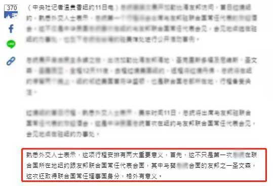 台湾“中央社”7月11日发布的一则新闻消息中明确指出,台湾地区领导人蔡英文近日将与联合国常任理事国代表会面,文中并借“熟悉外交人士”之口表示,此事格外有意义。