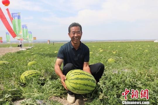 瓜农抱着即将成熟的硒砂瓜,脸上露出丰收的笑容。杨迪 摄