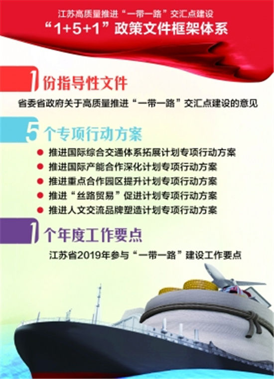 6月11日,江苏省政府召开高质量推进“一带一路”交汇点建设新闻发布会,据悉,江苏已形成了高质量推进“一带一路”交汇点建设的“1+5+1”政策文件框架体系——1份指导性文件,即去年底江苏省委省政府出台的《关于高质量推进“一带一路”交汇点建设的意见》;5个专项行动方案,即今年5月江苏省推进“一带一路”建设工作领导小组印发的《推进“一带一路”交汇点建设“五大计划”专项行动方案》;1个年度工作要点,即今年5月同时印发的《江苏省2019年参与“一带一路”建设工作要点》。