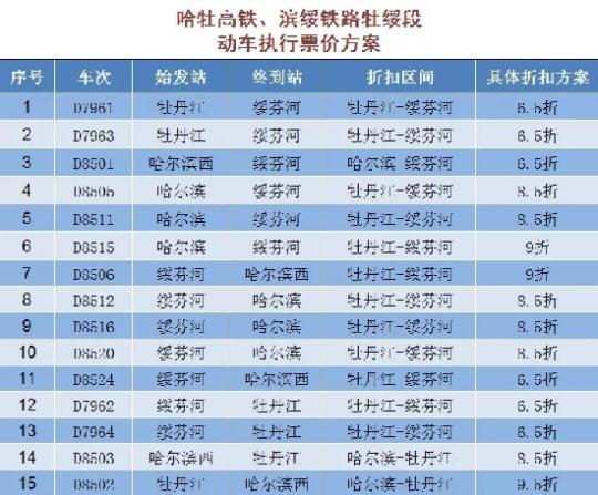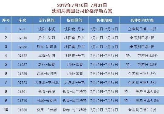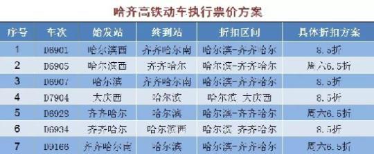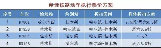 该票价方案执行时间自2019年7月10日起至另行通知时止。除上述公布折扣动车外,哈佳铁路其他动车组列车票价按公布票价9.47折执行。