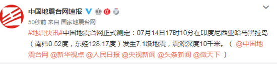 荔枝新闻讯 中国地震台网正式测定:07月14日17时10分在印度尼西亚哈马黑拉岛(南纬0.52度,东经128.17度)发生7.1级地震,震源深度10千米。