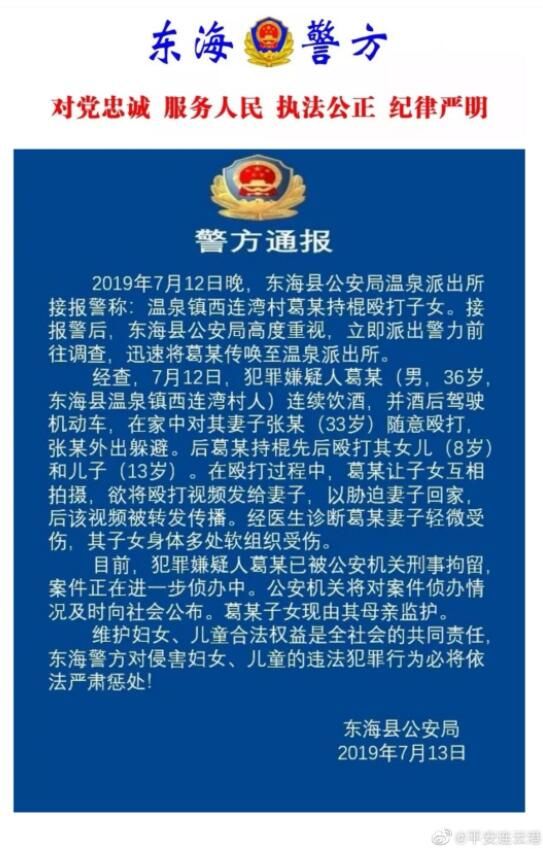 我苏网讯 2019年7月12日晚,连云港东海县公安局温泉派出所接报警称:温泉镇西连湾村葛某持棍殴打子女。接报警后,东海县公安局高度重视,立即派出警力前往调查,迅速将葛某传唤至温泉派出所。7月14日,东海警方发布事件通报。