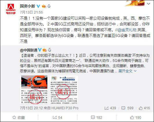 针对有网民质疑为何英国西班牙等国选了华为5G设备而联通选了诺基亚5G设备,@国资小新 回复“打脸”称,没有一个国家5G建设可以采购一家公司设备就完成,英、西、摩也不是全部用华为。中国5G正式商用还没开始,招标进行中,合同都没签,你咋知道没用华为?