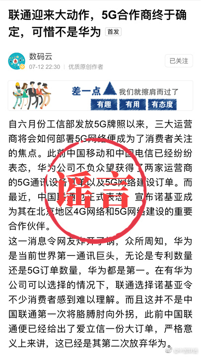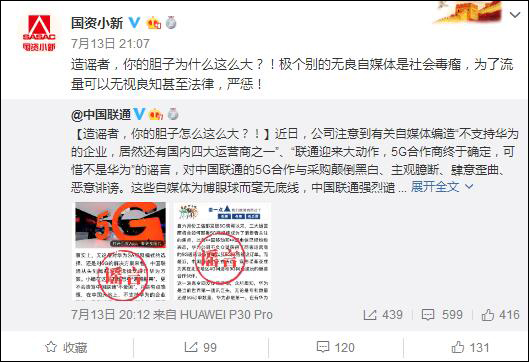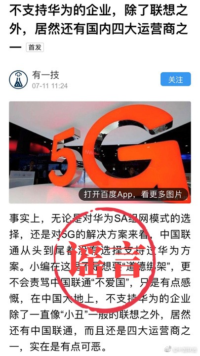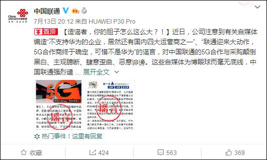 近日,公司注意到有关自媒体编造“不支持华为的企业,居然还有国内四大运营商之一”、“联通迎来大动作,5G合作商终于确定,可惜不是华为”的谣言,对中国联通的5G合作与采购颠倒黑白、主观臆断、肆意歪曲、恶意诽谤。这些自媒体为博眼球而毫无底线,中国联通强烈谴责这种居心不良、凭空捏造、滥扣帽子、煽动公众情绪、误导社会舆论、极度不负责任的造谣污蔑行为,并保留通过法律手段维护公司合法权益的权利。