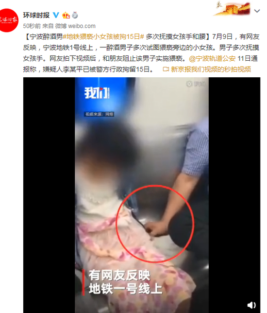 7月9日,有网友反映,宁波地铁1号线上,一醉酒男子多次试图猥亵旁边的小女孩。男子多次抚摸女孩手。网友拍下视频后,和朋友阻止该男子实施猥亵。@宁波轨道公安 11日通报称,嫌疑人李某平已被警方行政拘留15日。