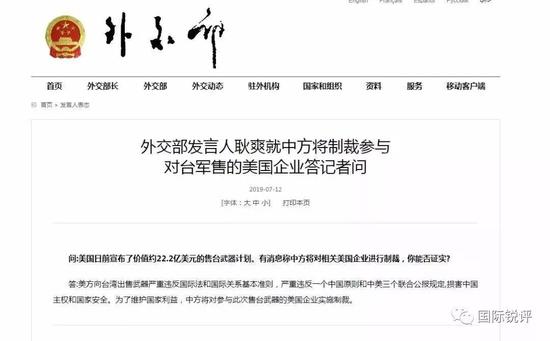 国际锐评:制裁对台军售美企 坚决维护国家利益