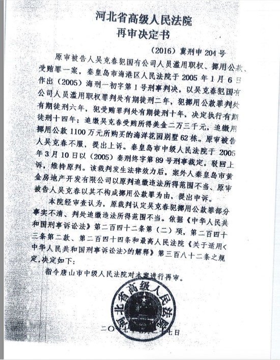 2017年7月,河北省高院对吴克春案件出具再审决定书。河北省高院认为,原审裁判“认定吴克春挪用公款部分事实不清、判决追缴违法所得范围不当”,指令唐山市中级法院对该案进行再审。