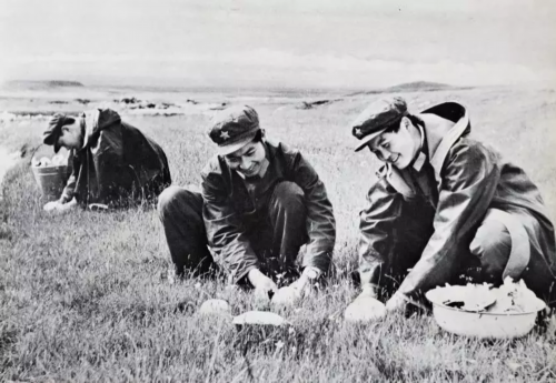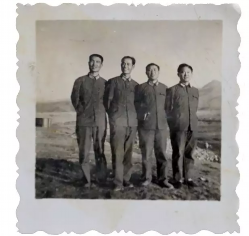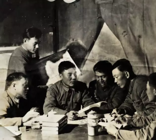 1976年,张步友(后一)与营长、指导员一起政治学习