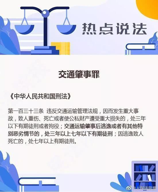 (法条链接《中华人民共和国刑法》第一百三十三条 违反交通运输管理法规,因而发生重大事故,致人重伤、死亡或者使公私财产遭受重大损失的,处三年以下有期徒刑或者拘役;交通运输肇事后逃逸或者有其他特别恶劣情节的,处三年以上七年以下有期徒刑;因逃逸致人死亡的,处七年以上有期徒刑。)