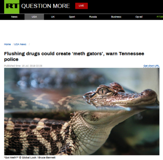 “今日俄罗斯”(RT)和《今日美国报》15日报道称,当地时间13日,美国田纳西州洛雷托警方在脸书上警告人们不要将毒品冲进下水道,因为可能有鳄鱼误食冰毒(又名甲基苯丙胺,methamphetamine),成了“冰毒鳄鱼(meth gators)”。