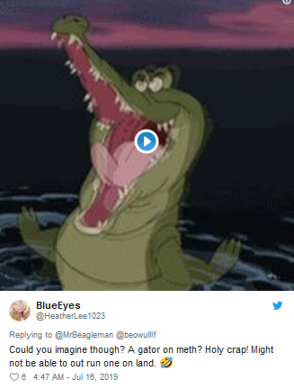 还有网友调侃。用户@HeatherLee1023:“你能想象吗?一只吸冰毒的鳄鱼?天哪!(我们)可能在陆地上也跑不过它。”↓