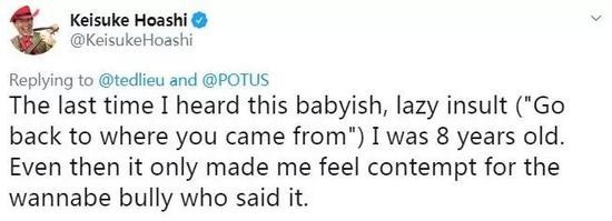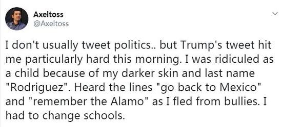 我通常不发政治相关的推特。但是今天早上特朗普的推特对我打击特别大。当我还是个孩子的时候,因为我的黑皮肤和“罗德里格斯”姓氏而被嘲笑。当我逃离那些霸凌时,听到了“滚回墨西哥去”和“记住阿拉莫”这些话。我那时不得不频频转学。