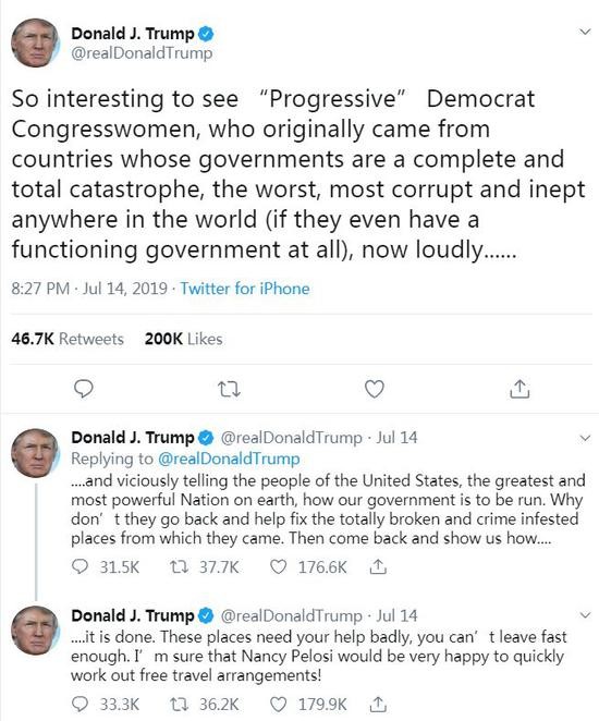 7月14日,特朗普在一系列慷慨激昂的推文中抨击几位民主党国会议员(均为有色人种女性),让她们哪儿来的回哪儿去,治理自己腐败不堪的国家去,别对美国指手划脚。
