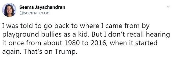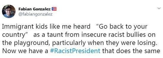 像我这样的移民孩子曾常在操场上听到“滚回你的国家去”,这是来自没有安全感的种族歧视者的讥讽,特别是当他们正输掉比赛的时候。现在我们有了一个同样行径的#种族主义总统