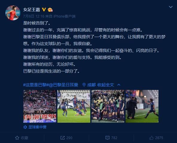 女足世界杯结束后,王霜与巴黎圣日耳曼女足传言解约的消息也尘埃落定。7月6日中午,王霜通过微博发文确认与巴黎圣日耳曼女足解约,新赛季将回归武汉江大女足。