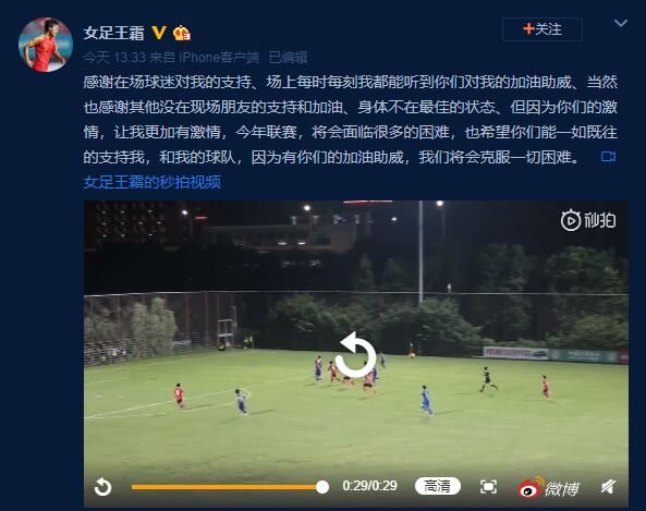 今日(7月16日)中午,王霜在微博上分享了自己的进球视频,对球迷表示了感谢。