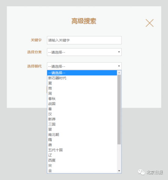记者注意到,该网页的检索分为简单检索和高级检索两种。在“高级检索”中,可以通过输入关键词、选择文物分类及朝代,比较精准地查询自己想找的文物信息。