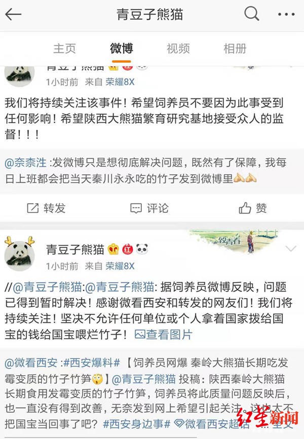 “如果国宝熊猫真的如网上所说吃了变质的竹子,熊猫的身体会好吗,我们每天对熊猫的各种饮食都会有严格的监控,所以不可能出现这个问题,关于这个事情他(饲养员)自己也做了说明,@微看西安 也对此事进行了重新说明,事实情况秦岭野生动物园稍后也会公布。”该工作人员说。