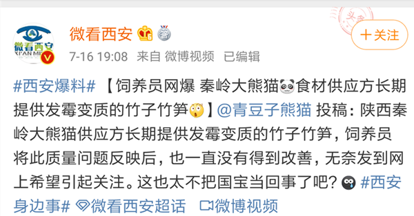 爆料人微博红星新闻记者注意到,7月16日晚,@微看西安 在之前发的微博下更博称:“转述:你好,我是饲养员,投稿人没有说清楚,会让人家误会大熊猫吃了这样的竹子,实际上是配送回来的烂竹子都扔了,请各位网友放心,我们会照顾好国宝的。”