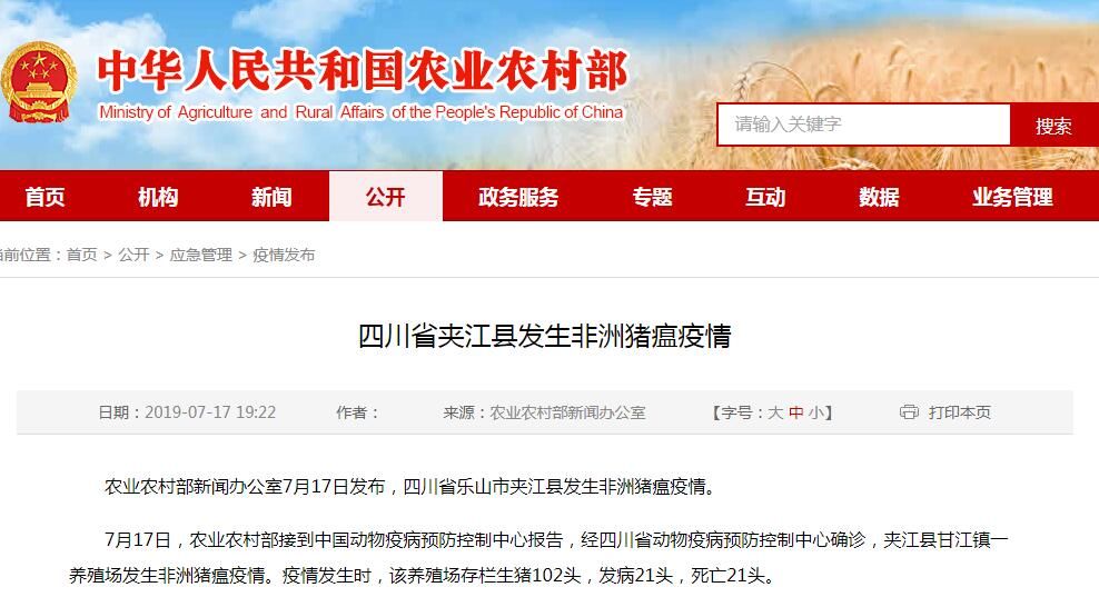据悉,7月17日,农业农村部接到中国动物疫病预防控制中心报告,经四川省动物疫病预防控制中心确诊,夹江县甘江镇一养殖场发生非洲猪瘟疫情。疫情发生时,该养殖场存栏生猪102头,发病21头,死亡21头。