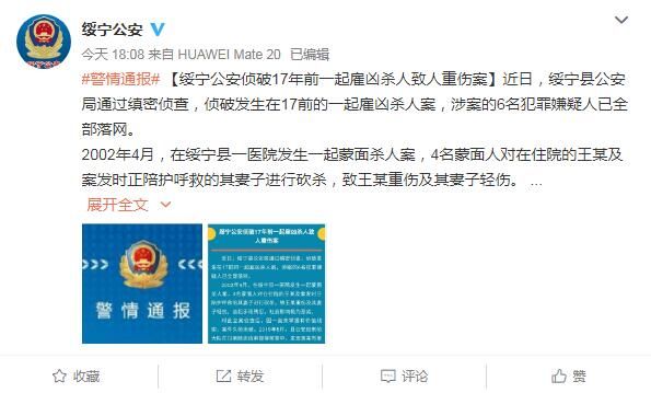 该通报称,近日,绥宁县公安局通过缜密侦查,侦破发生在十七年前的一起雇凶杀人案,涉案的6名犯罪嫌疑人已全部落网。