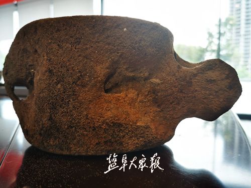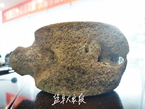 这块“石头”重约六七百克,上面有许多小孔,拿起时,不断有沙子落下。中国海盐博物馆文物典藏部江涤非介绍,经初步鉴定,这是一块距今约6000—11700年的鲸类脊椎骨亚化石,应该是一头成年或老年鲸的脊椎骨的后半段。
