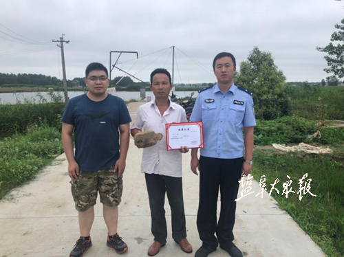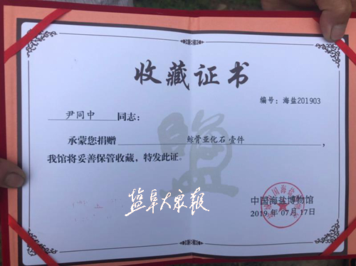 尹同中说,五六年前,他的岳父也在这个小鱼塘里捞起两块“石头”,后来联系了相关部门,经鉴定为鲸鱼化石。联想到这,他主动联系大冈派出所,民警智恒茂及时与中国海盐博特馆取得联系,报告了相关情况。