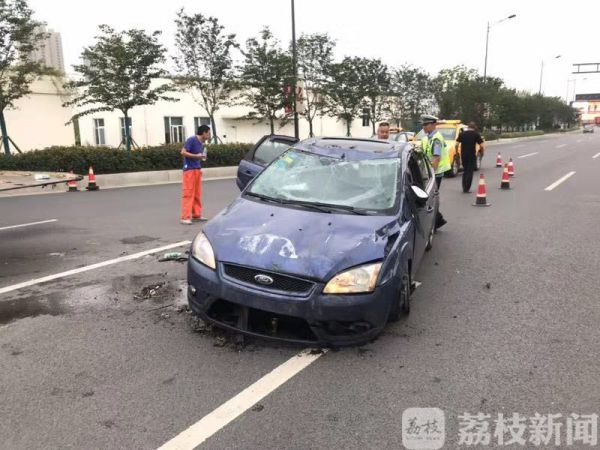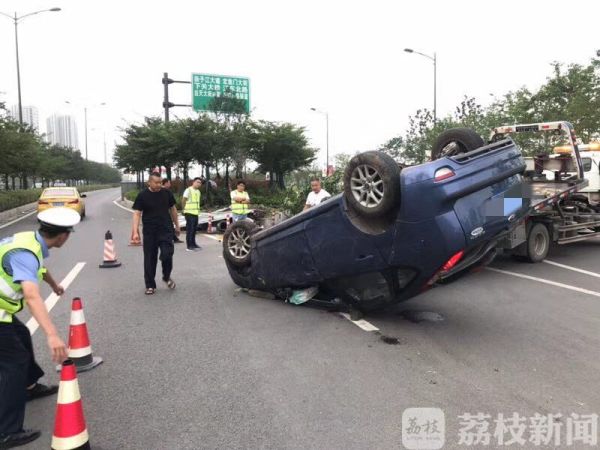 7月17日凌晨四点半左右,市民向南京交警五大队报警称一辆蓝色小车撞上浦镇大街扬子江隧道江北入口匝道口的花坛上,导致车辆侧翻。