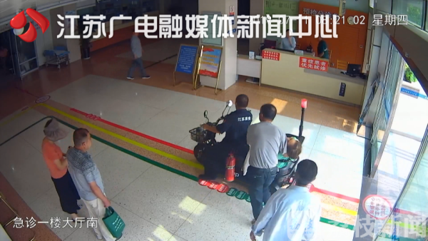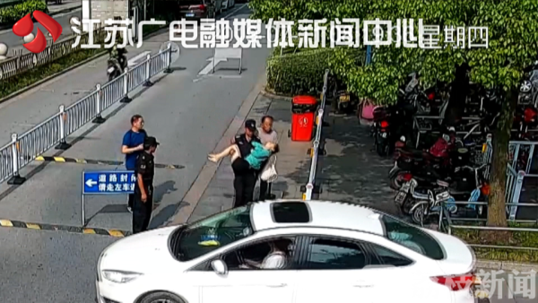 监控画面显示,当天早上8点多,扬州大学附属医院的保安张建胜吃力地抱着一名患者出现在了画面中,旁边还跟着患者的老伴儿,三个人急匆匆向急诊室方向走去,途中一辆巡逻车赶来接应,将患者及时送诊。张建胜告诉记者,事发当时他在医院南侧的停车场执勤,突然一辆车停了下来。驾驶员称车上有一名心脏病病人。
