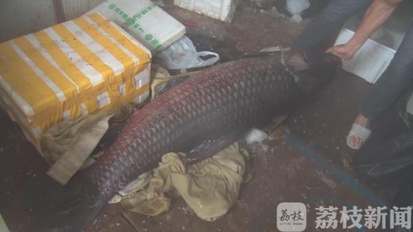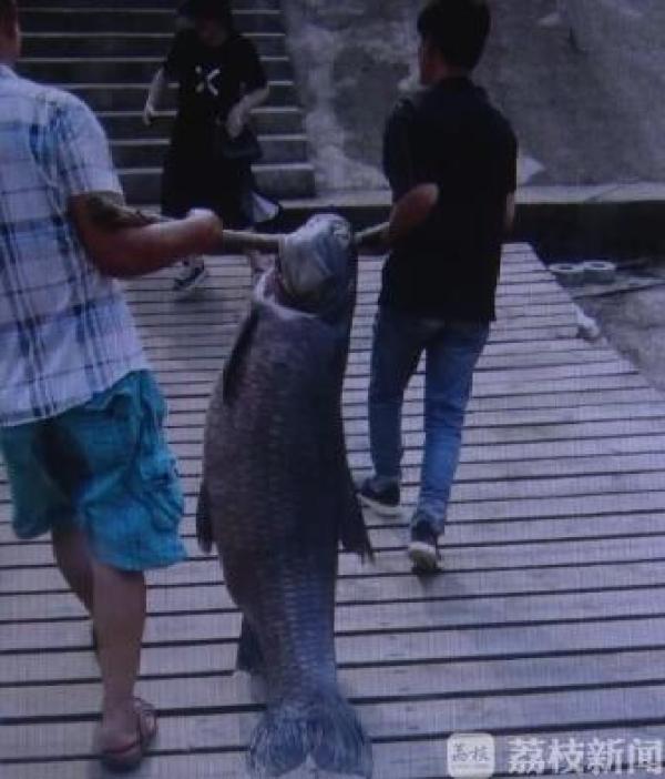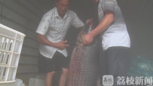 当天下午,几个渔民像往常一样驾着机船在金牛湖网阵里巡视,当他们巡视到湖东水域时,发现湖面上鱼网被拉走10多米,网里面不时漾起巨大水花。“当时就感觉里面一定是个大家伙,估计有百十斤以上,不然没有这么大的动静”。渔民说。他们赶忙打电话,喊来两名同事增援,四名壮汉用了两个小时,拖拽鱼网将大鱼拖上了船。看到这么大的鱼,几个人感慨:“想到是条大鱼,但没想到是这么个巨无霸!”