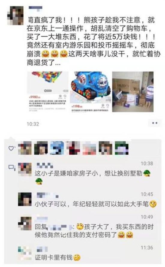 事后,郭先生妻子通过朋友圈吐槽:“简直气疯了我!熊孩子趁我不注意,一通操作,胡乱清空了购物车,买了一大堆东西……”