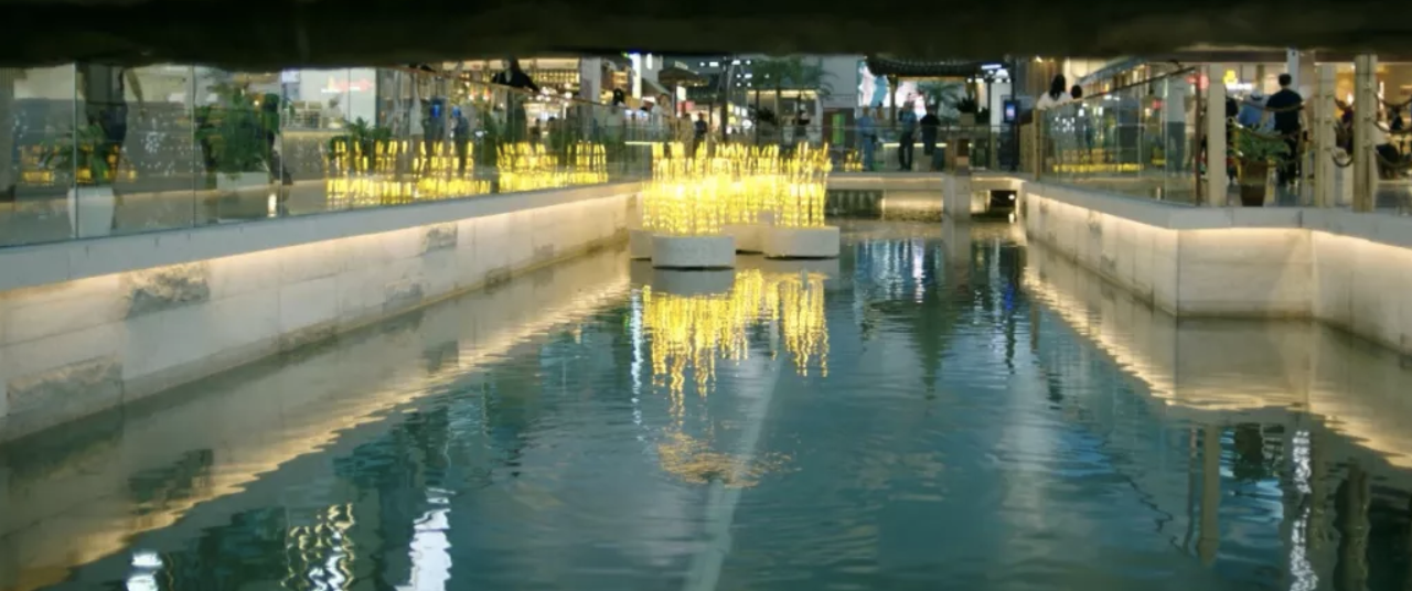 一条宽8米、长140米的景观河道穿主楼而过,经提纯净化的阳澄湖湖水潺潺流淌。