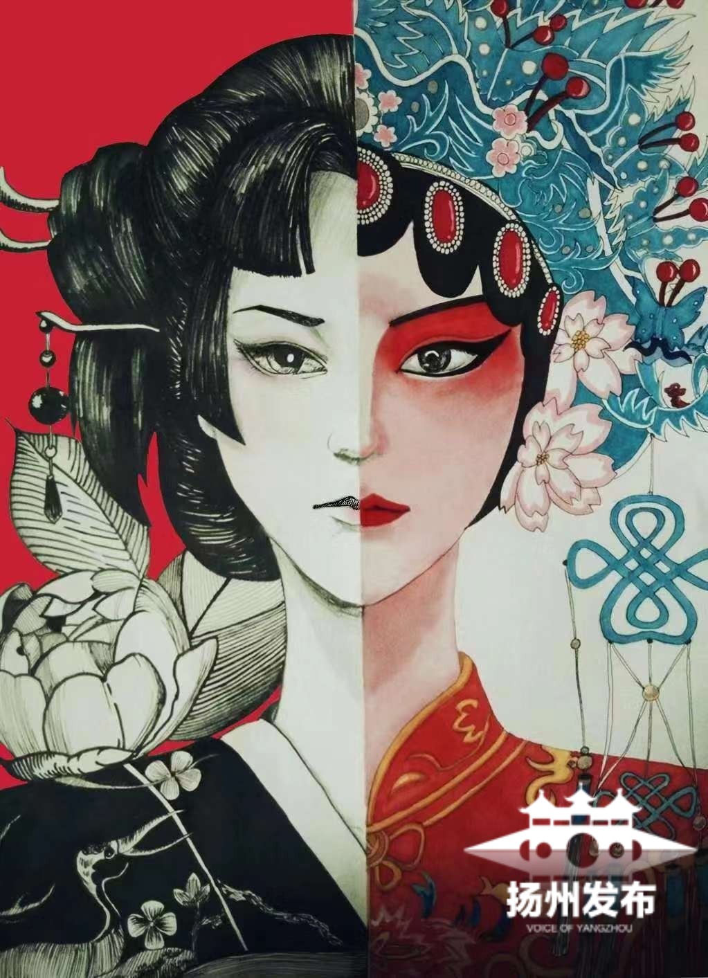 陈颖介绍,因为这次画展是在日本举行,中国和日本是近邻,应该秉承着世代友好的相处方式。所以她就想结合两国的文化,画出一幅代表和平与友好的作品。中国的戏剧、日本的艺伎,两种文化有着相通性,将两种艺术之美,融合在一张画面之中,寄寓着非常美好的愿景。