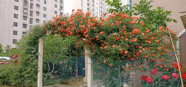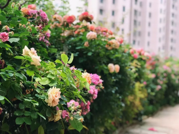 在曹月平的辛勤劳动下,楼前绿化带焕然一新。外围以蔷薇为主,约有五六个品种,花色、花型各异,花园内,种植的种类就更多了,光是月季就有近十个品种,还有牡丹、芍药、凌霄、紫薇等花卉以及枣树、桃树、葡萄树、柿子树、石榴树等果树,花一茬一茬地开,果子一茬一茬地结,看着让人心情十分好。