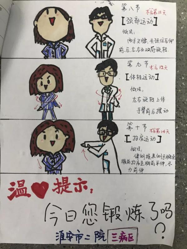 记者了解到,乳腺癌术后因部分组织切除或皮肤范围缩减很容易引起患肢功能障碍或活动受限,所以术后的功能锻炼就显得尤为重要,这对患者机体的康复、提高生活质量都有重要意义。“一般从术后24小时就需要锻炼,一直要坚持两三个月甚至更久。”据曹妍介绍,如果术后康复锻炼得好,患者能恢复正常肢体功能,反之则会出现肢体功能受限甚至减低术后生活质量,“比如胳膊抬不起来,不能自己穿脱衣服等等,给自己和家人都带来不便。”而她在工作中经常发现有患者不会做或者动作做不全、经常忘记,于是突发奇想,想利用自己的一技之长,用漫画的方式把每个动作进行分解,让患者更容易学会。“其实也没什么,我希望我们病房的患者都能恢复健康。”曹妍说。
