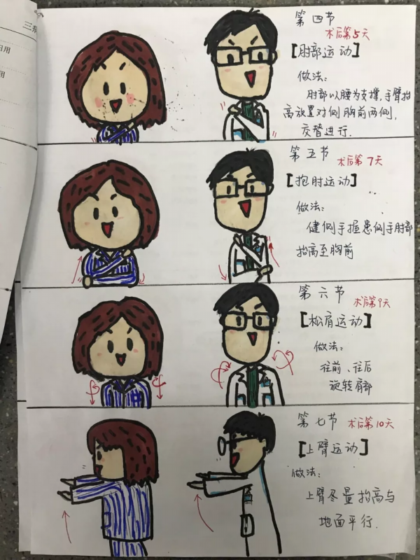 翻开这本暖心的漫画版的乳腺癌术后功能锻炼手册,漫画中穿白大褂、带方框眼睛的“孙医生”生动有趣,一共10节操每一节都详细标注了什么时候需要锻炼以及动作要领,生动画风不仅一目了然,还让患者更容易理解和操作,患者刘女士说:“以前虽然护士每天都跟我说,但我老记不住,还经常会忘记,现在有这个手册真方便。”她告诉记者,现在她每天都坚持做,出院回家也要坚持做。