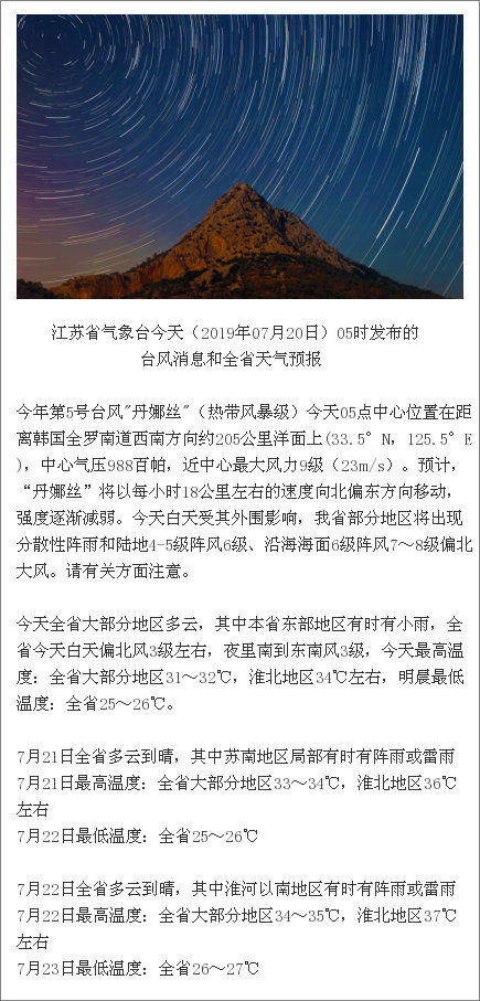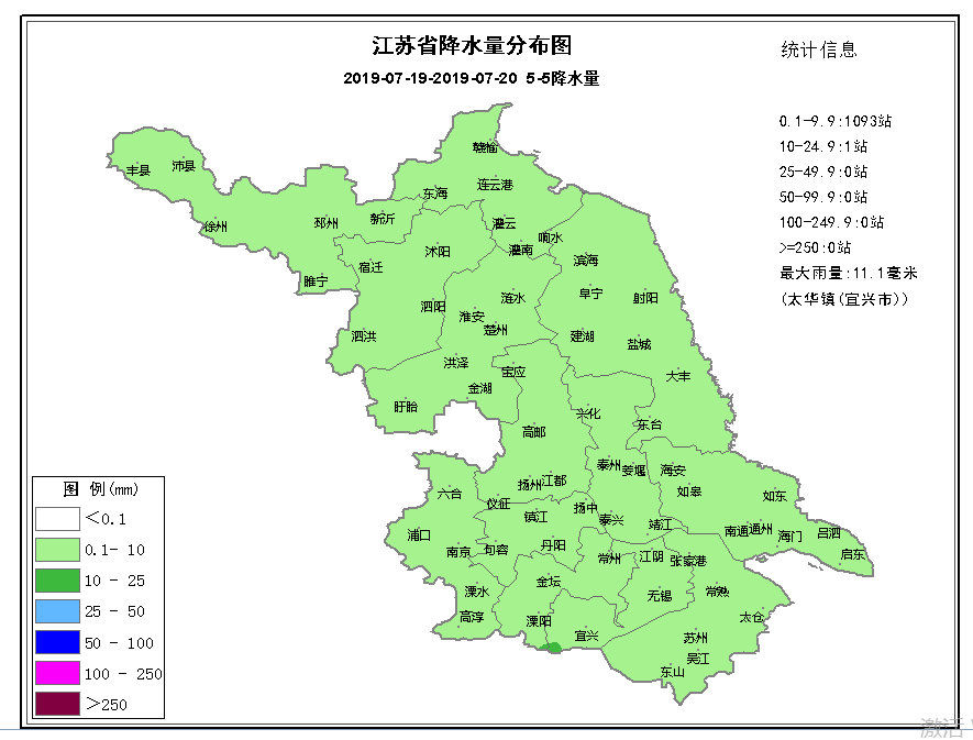 19日05时-20日05时,受台风“丹娜丝”外围云系影响,我省大部分地区出现小雨,局部中雨,雨量前三位分别是宜兴市太华镇11.1mm、宜兴市横山水库8.9mm、海安市角斜镇老坝港8.5mm,全省无8级以上大风。目前全省探测范围内无明显降水回波。