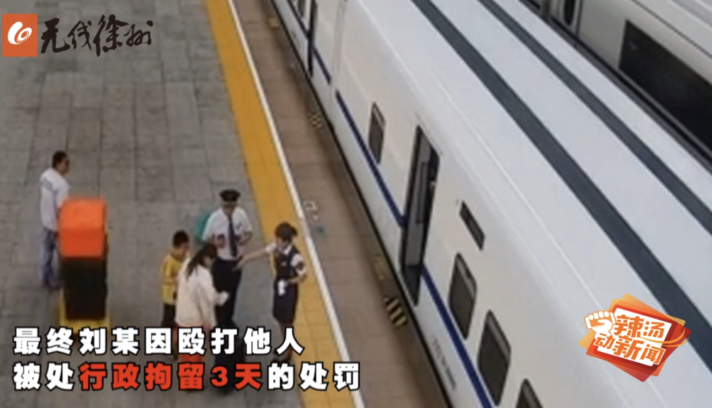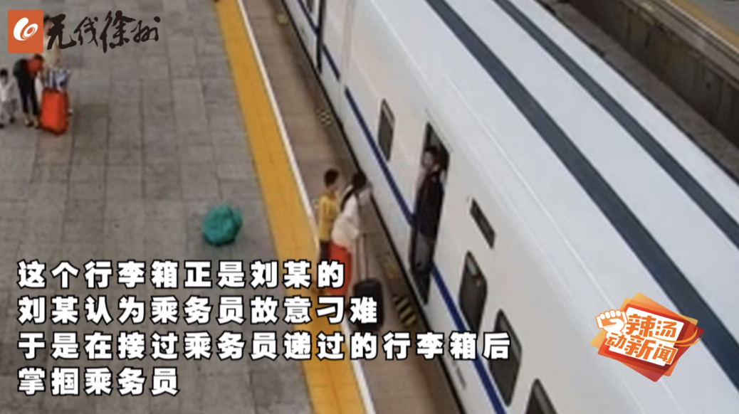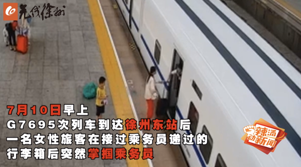 7月10日早上8点50分左右,由淮北开往江山的G7695次列车到达徐州东站后,乘客刘某在接过乘务员递过的行李箱后突然掌掴乘务员。
