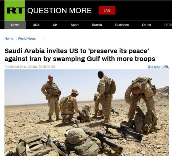 RT援引沙特国家媒体19日报道称,为加强与美国在维护地区安全稳定与和平方面的合作,沙特阿拉伯国王萨勒曼已批准接待美国士兵入驻。与此同时,美国五角大楼在当天晚些时候发表的一份声明中表示,已批准美国军队及相关资源装备向沙特阿拉伯转移,证实了有关美国为应对伊朗威胁,在沙特及卡塔尔部署军队的相关消息。