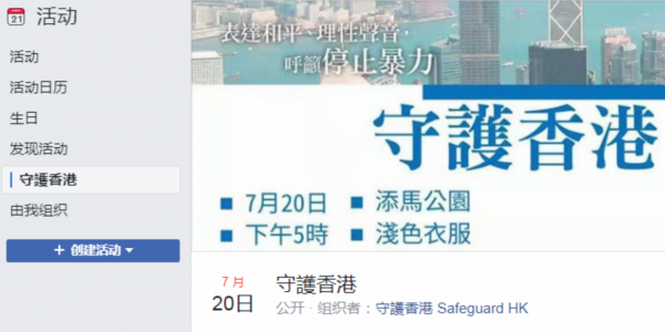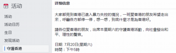 “表达和平、理性声音,呼吁停止暴力 ”。在社交网站“脸书”上,名为“守护香港”的账号发起了一场集会活动:“720守护香港”。