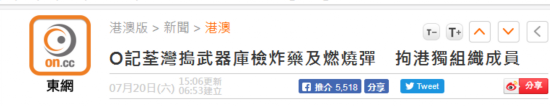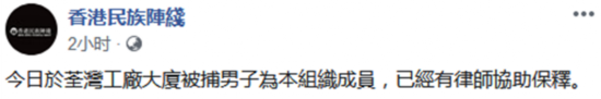 香港“东网”此次也报道称,在查出爆炸品的大楼现场,警方查获印有“香港民族阵线”字样的T恤,“香港民族阵线”则承认被捕男子是该组织成员。